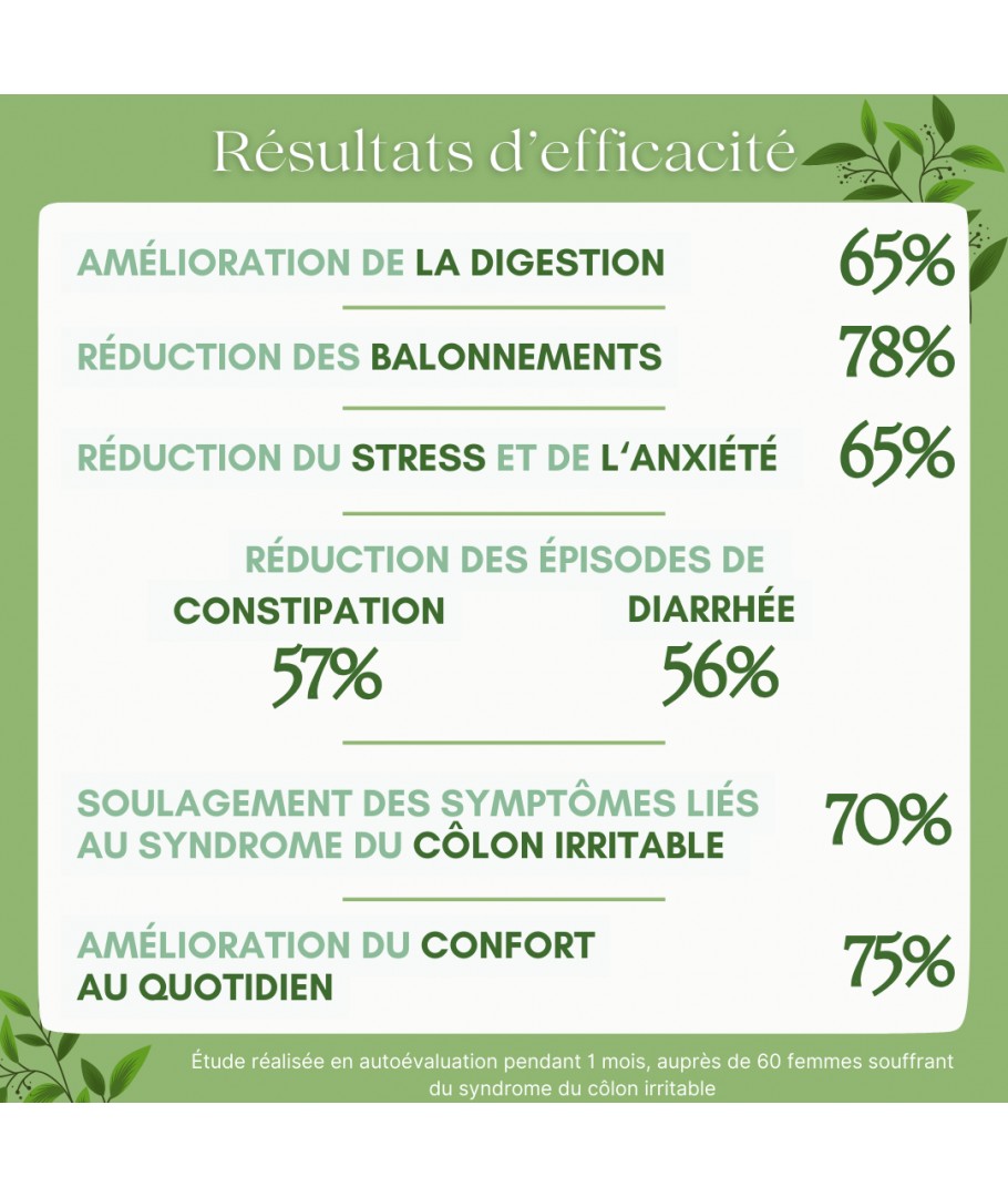 Une étude en auto-évaluation menée pendant 30 jours auprès de 60 femmes souffrant du syndrome du côlon irritable a montré des résultats significatifs sur les symptômes intestinaux et le bien-être général :
